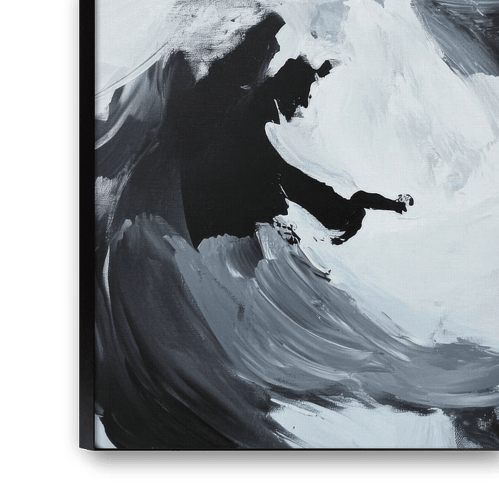 In a virtual dance of black and white, a spiralling movement unfolds, drawing the viewer into a penetrating play of light and shadow. The dynamic brushstrokes appear mysterious and lively, while evoking emotions and stories from an unexpected stillness. A play of chaos and harmony that invites you to marvel.