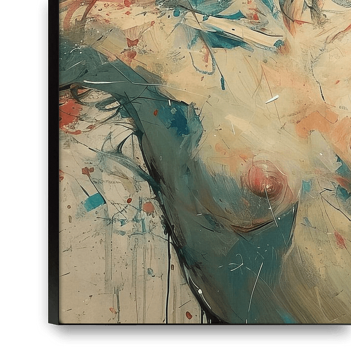 Dynamics | - This vibrant, urban art painting brings together a female portrait with an explosion of dynamic brushstrokes. Contrasting carmine and turquoise hues dance across the canvas, while fleeting splashes and streaks suggest movement. The raw, emotional energy speaks volumes.