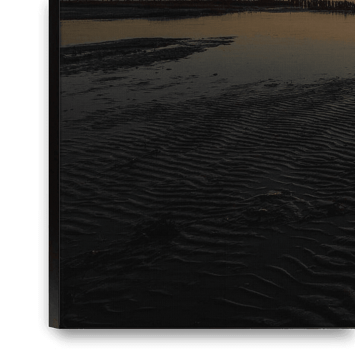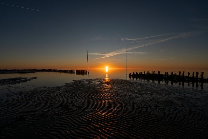 The sun touches the horizon, setting water and sand ablaze with fire and shadow. The light draws a bright line across the scene, while the colours slowly shift from warm gold to deep blue. Ripples in the mudflats catch the first light. Everything stands still for a moment, as night turns to morning.