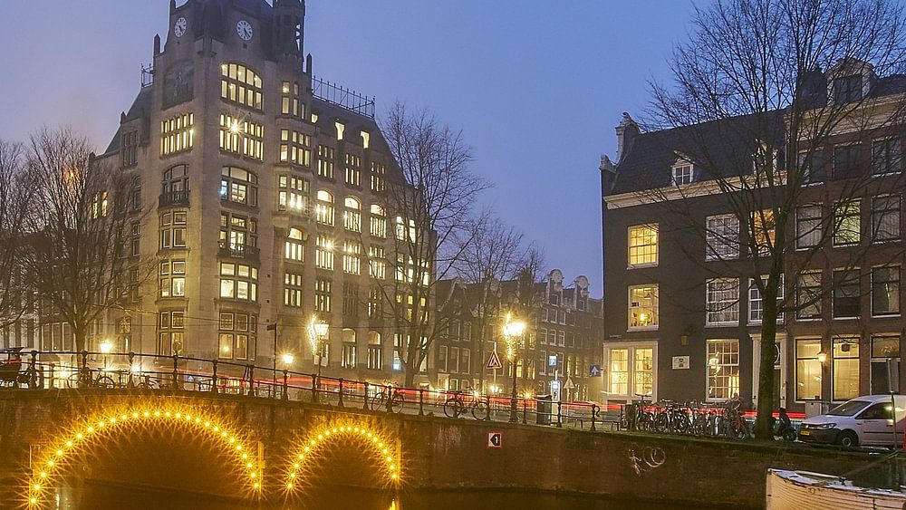 On a misty day, in the early evening, still managed to take in the effect of the blue hour. Evening photography at Amsterdam's canals.