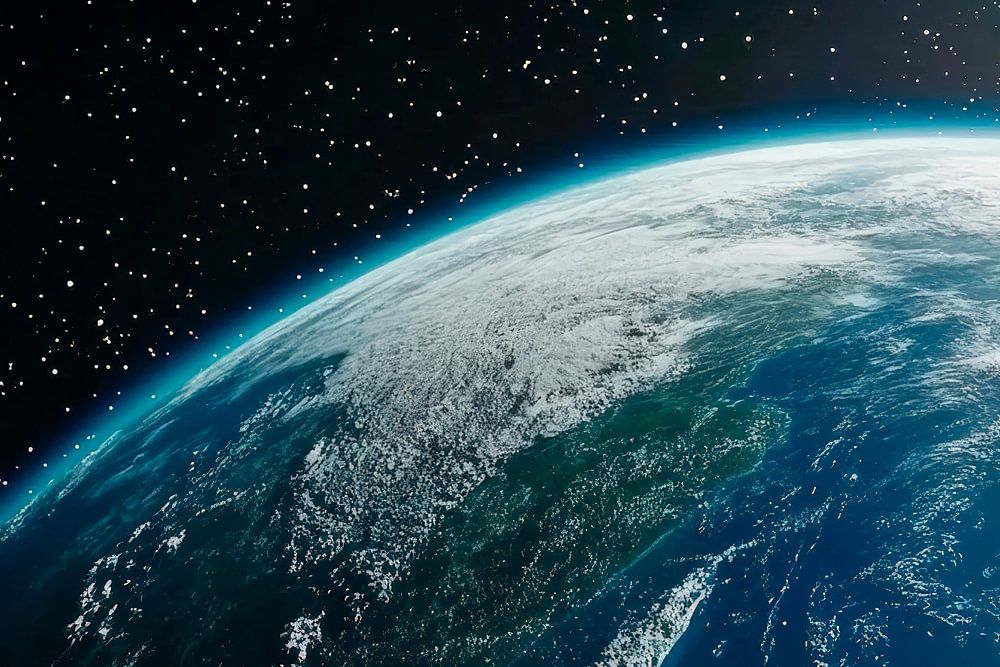 A fascinating view of the earth, framed by the infinite expanse of space and the gentle glow of the sun. The vivid colours and the impressive starry sky cast a spell over the viewer. This picture is perfect for a modern living room to create an inspiring atmosphere.
