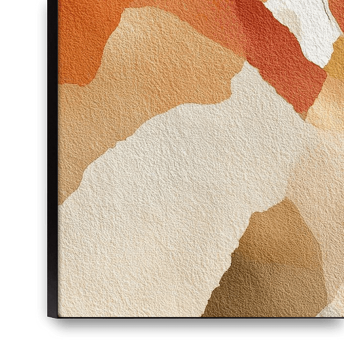This image shows an abstract work with a clear organic structure. The shapes are rounded and flow into each other. A colour palette ranging from off-white to orange, rust red, warm brown and beige was chosen. The surfaces overlap and connect naturally, without sharp lines or corners.