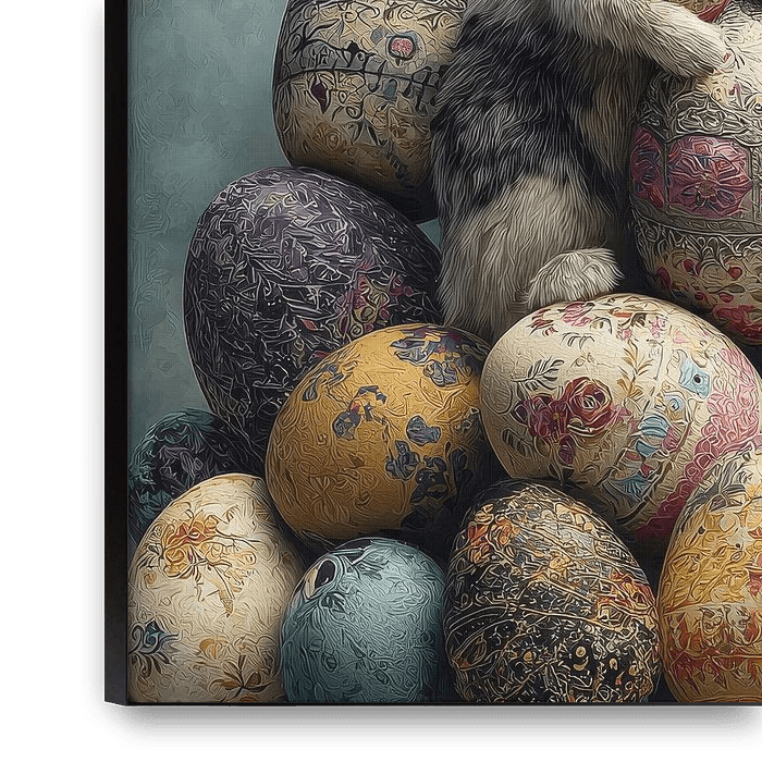 Buy this still life Easter bunny among colourful Easter eggs by But First Framing on canvas, ArtFrame, poster and wallpaper, printed on demand in high quality