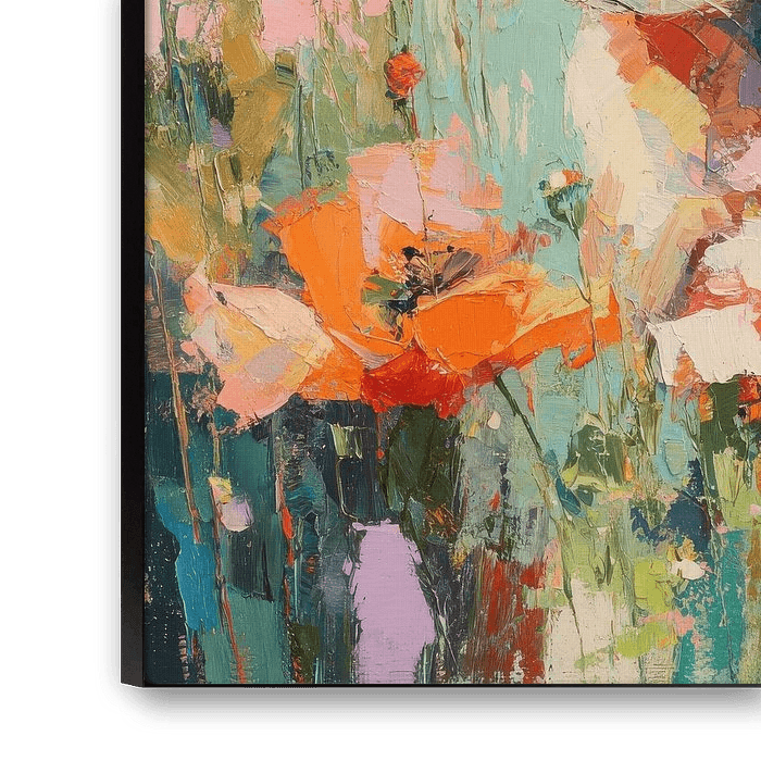 An abstract Easter bunny sits in a field of flowers, painted in a vintage oil style. The work captivates with its soft pastel tones, light colours and bright poppies in pink and orange. The oil texture and abstract realisation give the painting depth and movement, while the delicate brushstrokes create a harmonious, peaceful atmosphere. This work of art combines a festive Easter mood with a charming, playful character and radiates warmth, joy and poetic elegance.