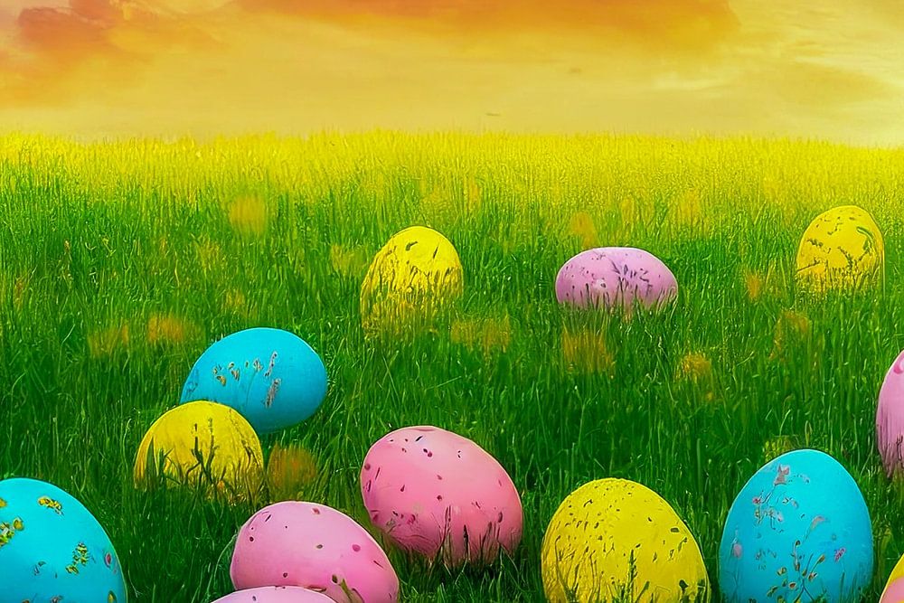 Buy this illustration Easter eggs on green grass, illustration by Christian Keiler on canvas, ArtFrame, poster and wallpaper, printed on demand in high quality.