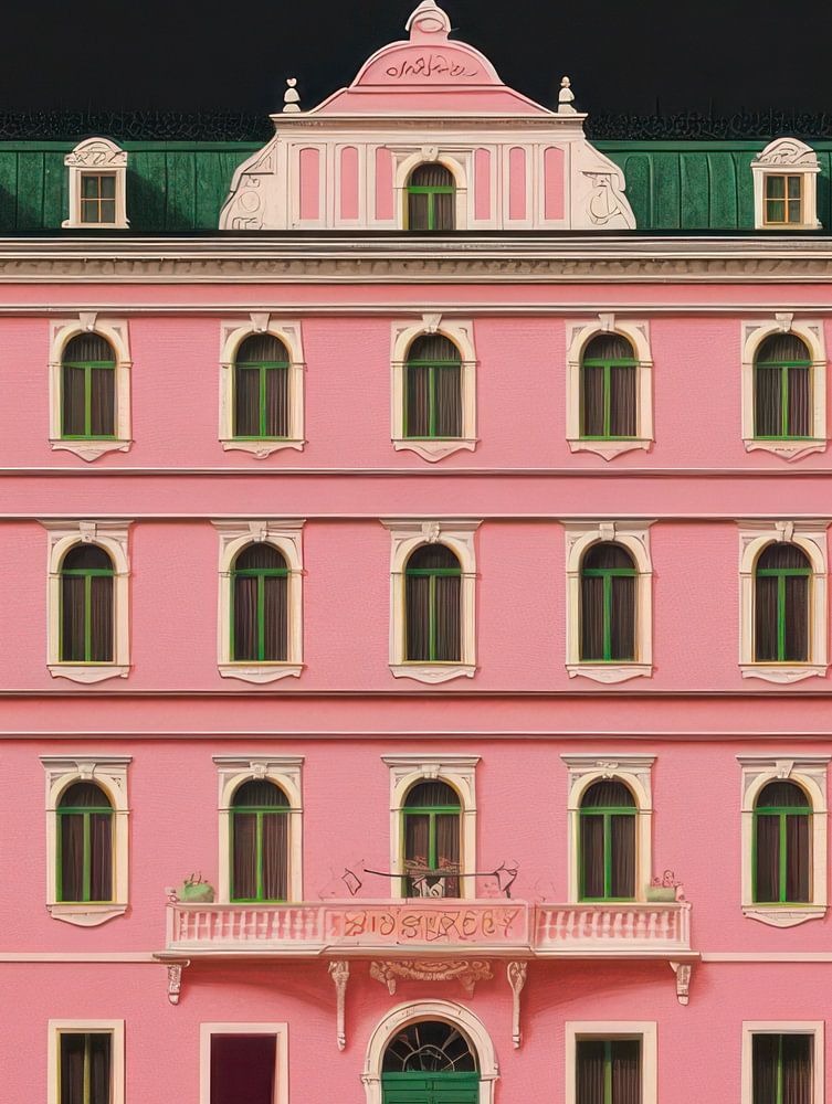 This work is an ode to stillness, beauty and architectural poetry. The pink hotel, perfectly symmetrical and cut as if from a dream, stands like a beacon of nostalgia in a deep black universe. The contrast between light and dark makes the building float in an almost surreal void. The small figure at the foot of the building reminds us of the scale of our dreams - grand and compelling, but always with room for wonder