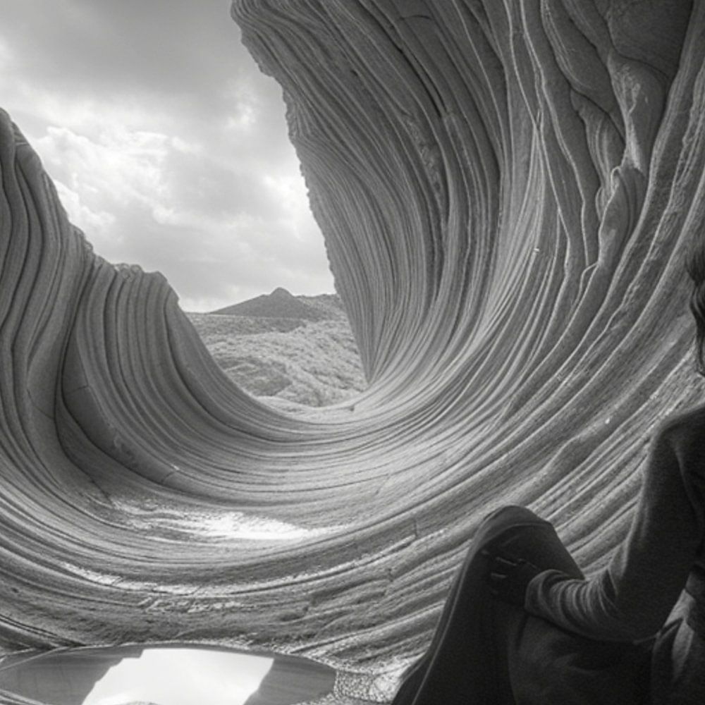 "Echoes of Silence" is an artwork that captures the quiet but powerful resonance of introspection and self-discovery. You see a woman depicted sitting in a majestic, spiralling gorge surrounded by layered rock formations rising like waves of silence and reflection.