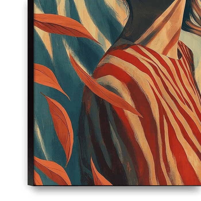 This work of art embodies the fusion of human emotion and natural elements. A woman with closed eyes and flowing hair is surrounded by swirling autumn leaves, which evokes a feeling of freedom and surrender. The warm, intense colors contrast with the serene expression on her face, creating a tension between inner peace and outer…