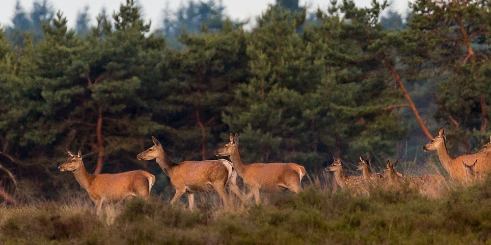 Als je van de natuur wilt genieten moet je soms vroeg je bed uit... 4 Uur 's morgens ging de wekker, maar wat hebben we veel gezien. Een roedel hinden met kalfjes op de heide langs de rand van het bos bij Uddel.