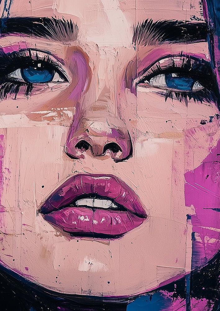An intriguing portrait of a woman in vibrant shades of pink and blue, with a gold foil background that adds a luxurious sheen to the whole. This artwork is done in a bold, edgy style that uses mixed media, with different textures and techniques complementing and enhancing each other. The painting contains expressive brushstrokes that evoke a dynamic and emotional mood, with a loose style that immediately appeals to the viewer. The influence of pop art is evident in the vibrancy of the colours and the playful approach to the subject, giving the portrait not only visual impact but also a sense of modernity and creativity.