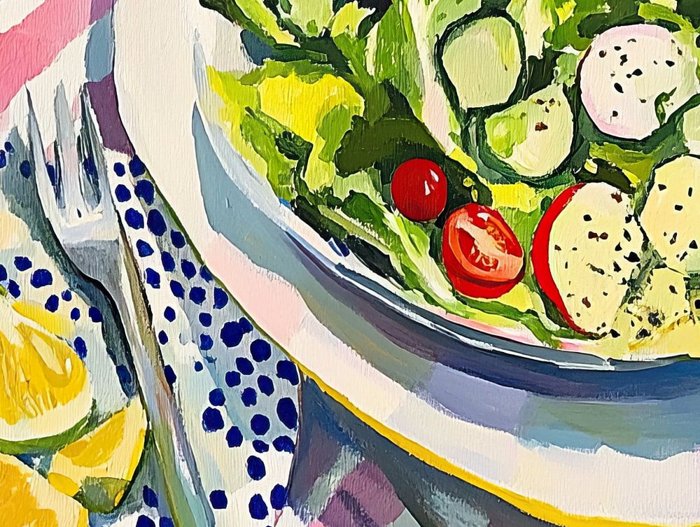 Food art - This food painting shows a vibrant and colourful meal on a set table, with a bowl of green salad decorated with white cheese and red tomatoes, and a plate of sliced lemons and figs on a blue and white dotted plate, all on a background with pink and white stripes.