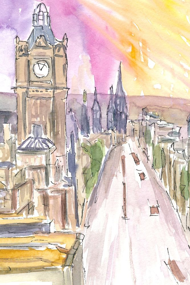 Buy this painting Edinburgh Princess Street at sunset by Markus Bleichner as a reproduction on canvas, ArtFrame, poster and wallpaper, printed on demand in high quality.