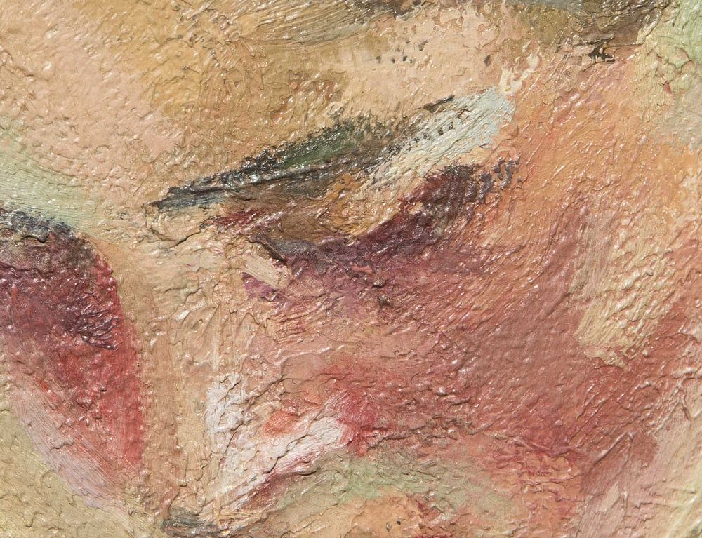Only the head with face and a piece of a woman's neck, armpit and arm. Throughout the portrait, the young woman puts on her stockings.