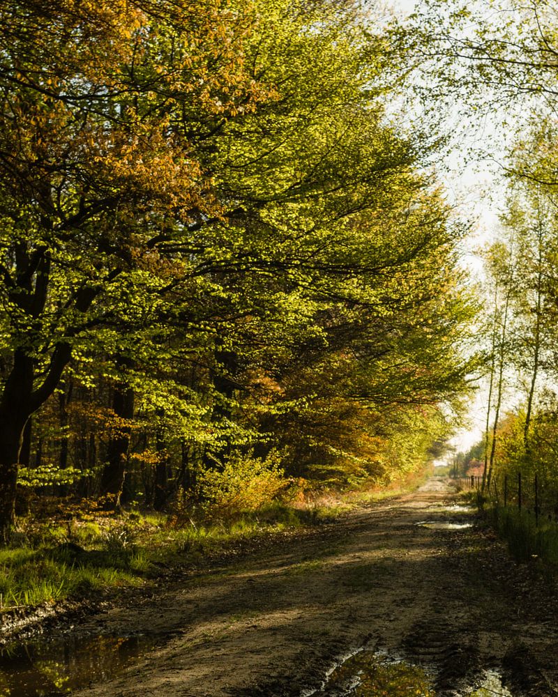 Dit is een bospad na een hevige regenbui. het is er drassig. Het is vroeg in de lente en er zit nog niet veel groen blad aan de takken. Daardoor komt het zonlicht nog makkelijk door de bomen heen.