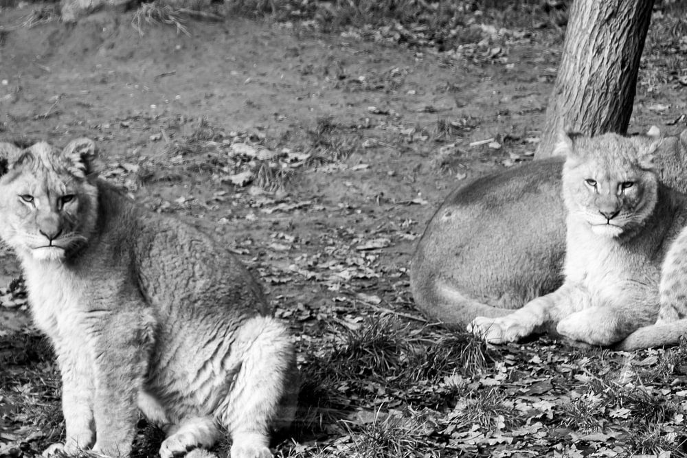 Een zwart wit foto van een leeuwin met haar welpjes, die allemaal nieuwsgierig vooruitkijken.