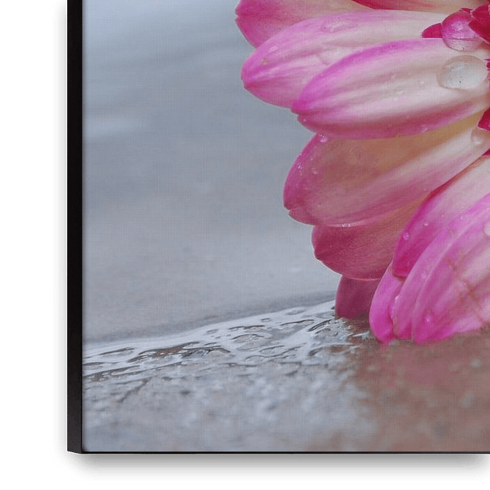 Macrofotografie. Bloemen. waterdruppels. Een roze Gerbera met waterdruppels liggend in het zand. Een rustgevend ogende foto met een bloem als hoofdobject. Scherpgesteld op de waterdruppels voor het mooie effect.