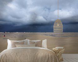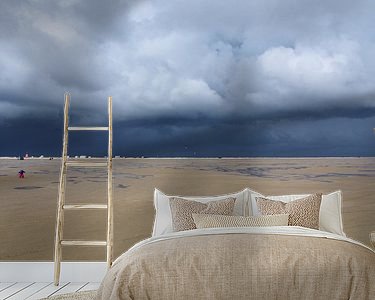 Een bruin zandstrand met in de verte donkere dreigende regenwolken. Op de voorgrond zijn nog witte wolken, wat een leuk contrast geeft. Genomen in 2018 in Denemarken.
