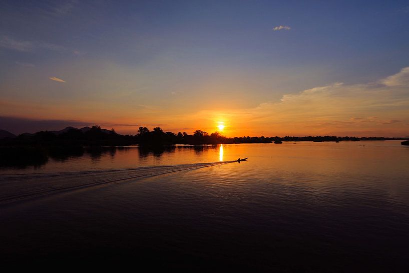 De zon gaat onder in het prachtige 4000 islands in Laos, als deze visser voorbij vaart op de Mekong Rivier.