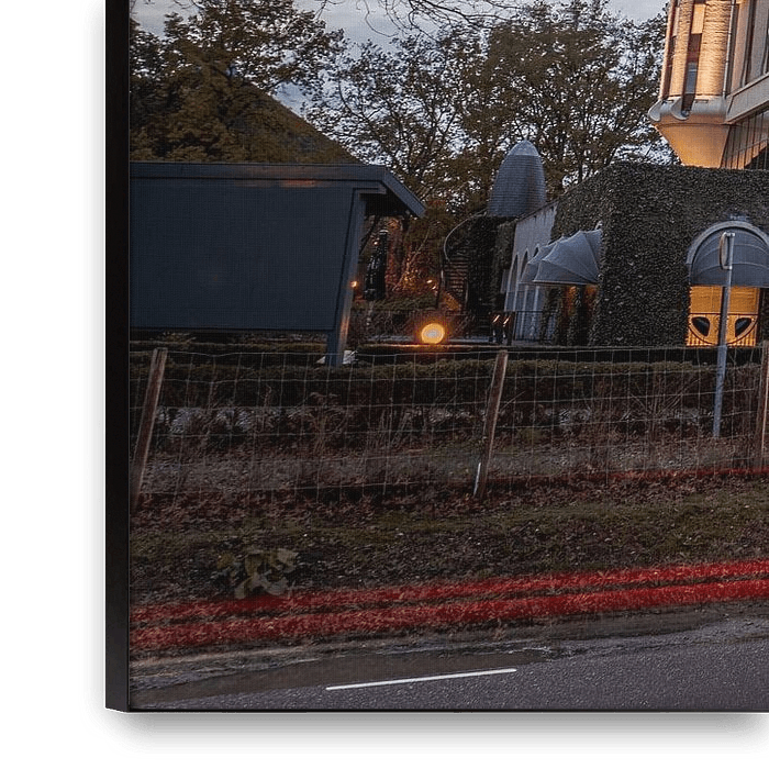The photo 'Efteling Hotel in Kaatsheuvel' was taken by Zwoele Plaatjes, at dusk. The hotel, located in North Brabant, stands in stark contrast to the surrounding landscape. Streaks of light, created by movement, illuminate the hotel's facade. It is a magical moment, capturing the magic of this special fairytale hotel. With its unique…