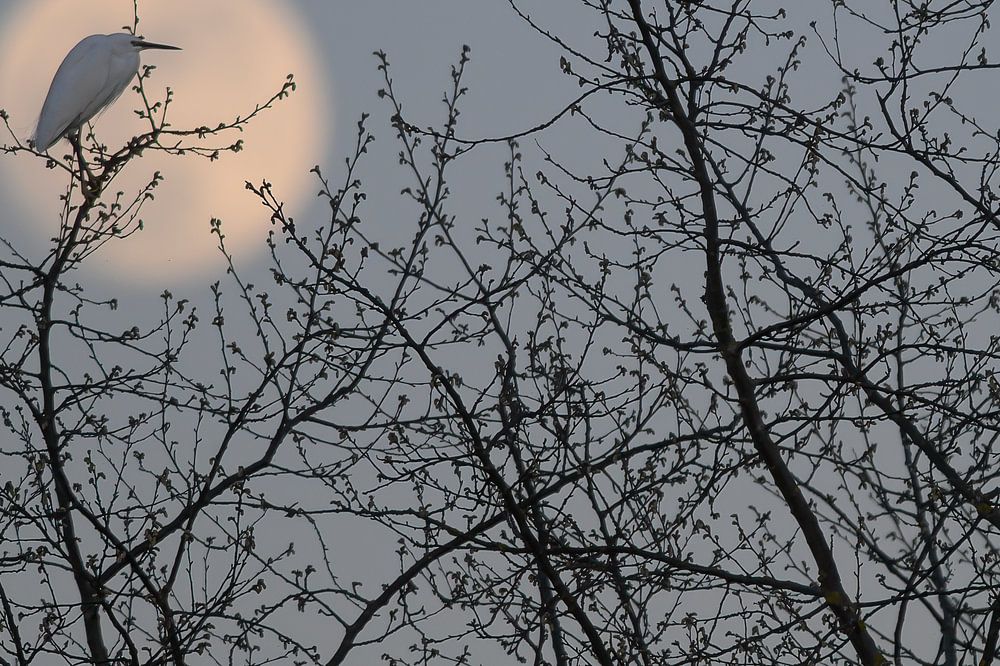 In this photograph, you can see a little egret that has chosen a remarkably peaceful spot just before sunset: high up on a bare branch, perfectly aligned with the rising full moon. Because it was still light enough, the fine details of the bird remain visible — from the soft contours of its feathers to the slight sheen on its beak. That…