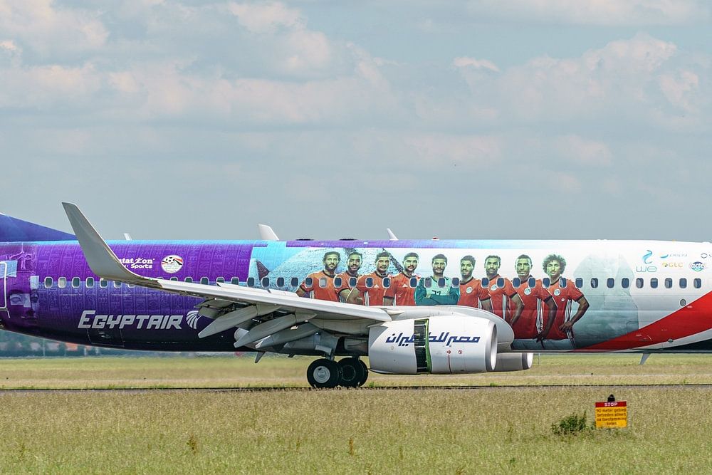 Egypt Air Boeing 737 with national football team livery.Registration: SU-GEN. The aircraft features a special livery, namely of Egypt's national football team. The photo was taken on 17 June 2019 along Polderbaan near Schiphol Airport.
