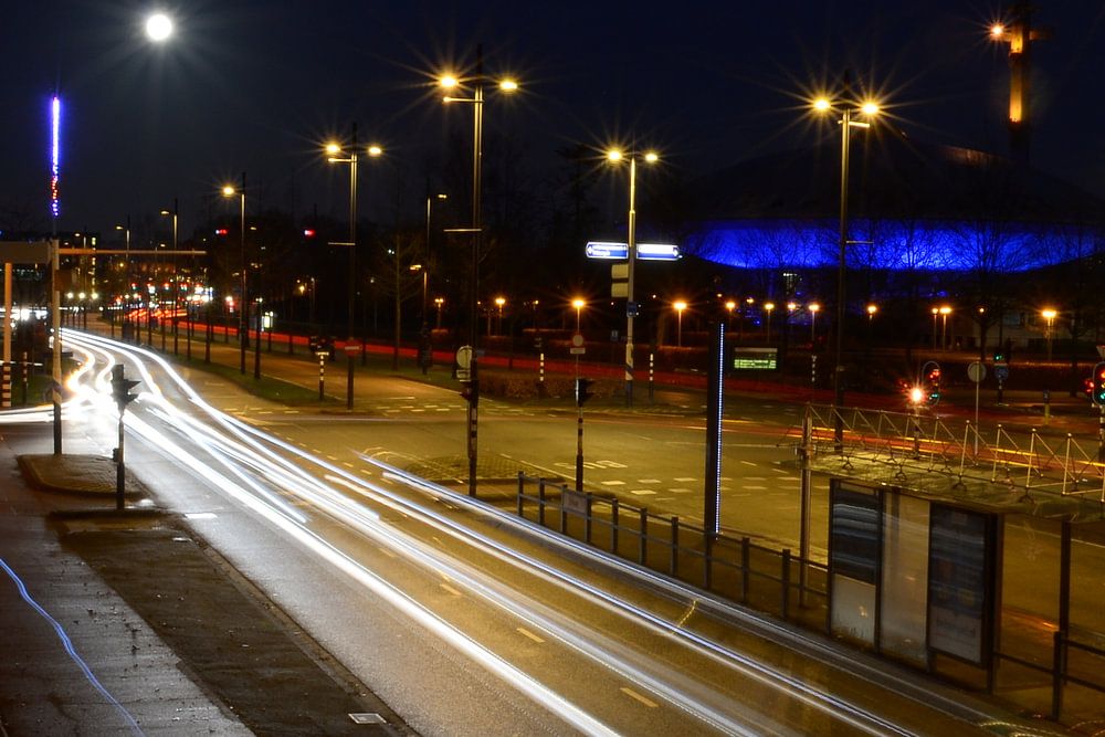 een blik op Eindhoven bij nacht rondom het Evoluon