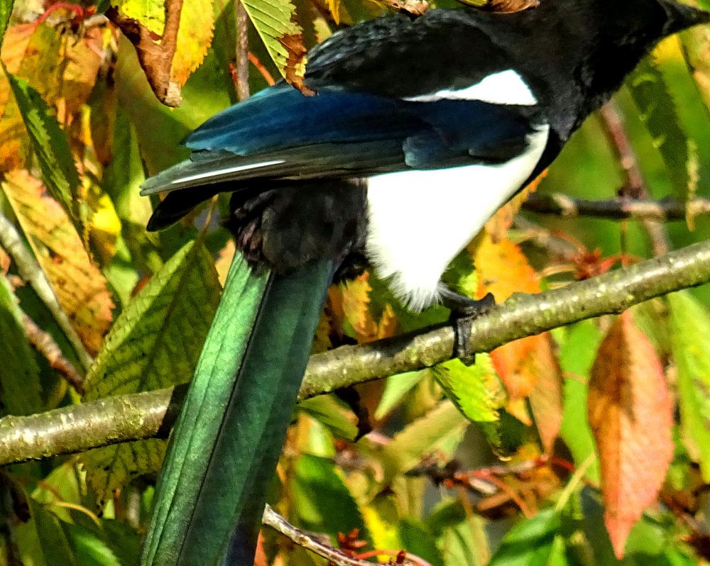 Mooie ekster met metaalgroene glans op de lange staart in een boom met herfstkleuren.