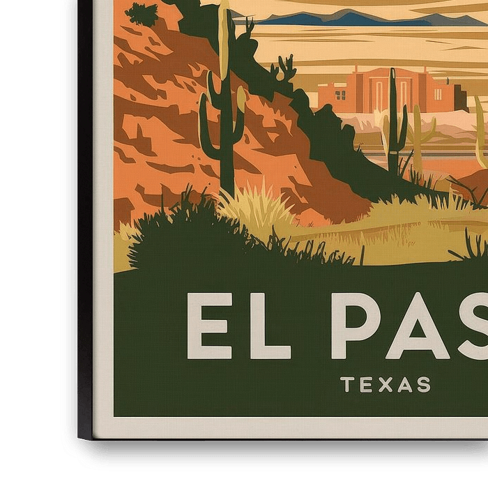 A captivating piece that captures the majestic desert landscape of El Paso, with dramatic mountains and distinctive cacti. The warm earth tones and crisp, cool aura lend an inviting atmosphere to any room. Ideal for a living room, where it combines conversation and relaxation in one. Perfect for nature lovers!