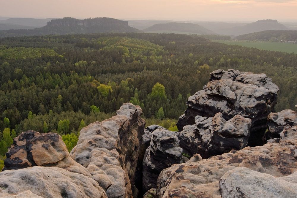 Elbe Sandstone Mountains - Panoramic view from the mountain "Gohrisch" in west direction in back light, evening light with light haze, in the foreground sandstone rocks - Location: Germany, Saxony, Elbe Sandstone Mountains, Saxon Switzerland, Gohrisch