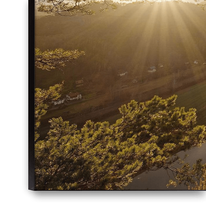 Elbsandsteingebirge - View from the "Bastei" through trees in direction west of the Elbe river shortly before sunset, sunrays, back light - Location: Germany, Saxony, Saxon Switzerland, Rathen, Bastei