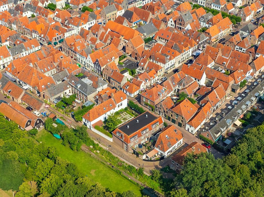 Elburg ancient walled town seen from above during a beautiful summer day in Gelderland, Netherlands. Elburg used to be a fishing town, but now is more focussed on tourism for its location close to the Veluwemeer and Veluwe as popular tourist destinations.
