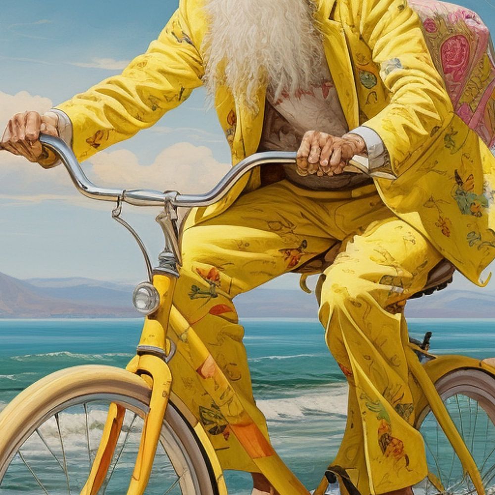 This dynamic image shows an elderly person with long, white hair and beard riding a matching bicycle on the beach in a bright yellow suit. The suit is decorated with colourful butterfly motifs, giving the appearance a playful and unconventional touch. The person is wearing sunglasses and their facial expression is a seemingly surprised or excited open mouth. In the background is a wide, sunny beach with a calm sea and a blue sky with hair blowing in the wind. The scenery conveys a sense of freedom, humour and joie de vivre, as if the person is going on a carefree journey.