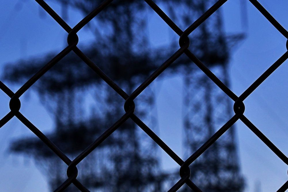 On purpose blurred high voltage tower behind a fence. This shot was taken right after sunset at the Glen Canyon dam in Page, Arizona. This huge pylon is part of the water power station in the Lake Powell.