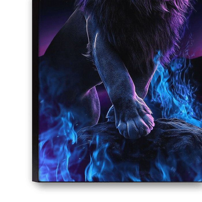A roaring lion bathed in vibrant neon purple and electric blue light, standing on a rock amidst blue fire. This surreal, cyberpunk aesthetic captures the animal's fierce energy and raw power in a cosmic setting.