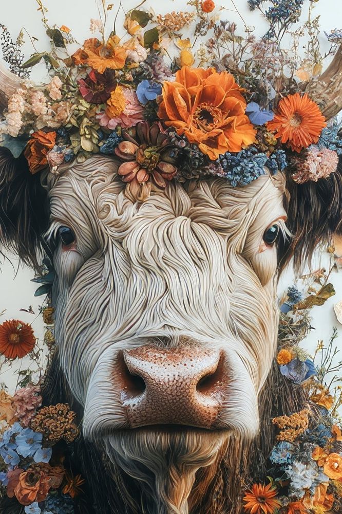 This particular art image shows a highlander adorned with an ornate floral wreath of orange, blue and pastel colours. The interplay between the robust horns and the soft floral arrangement symbolises the balance between brute strength and refined beauty. The detailed rendering of the texture of its fur and the delicate petals highlight the animal's natural splendour and serenity. This intriguing composition would fit perfectly into a rustic or bohemian interior, bringing the peace and beauty of nature inside.