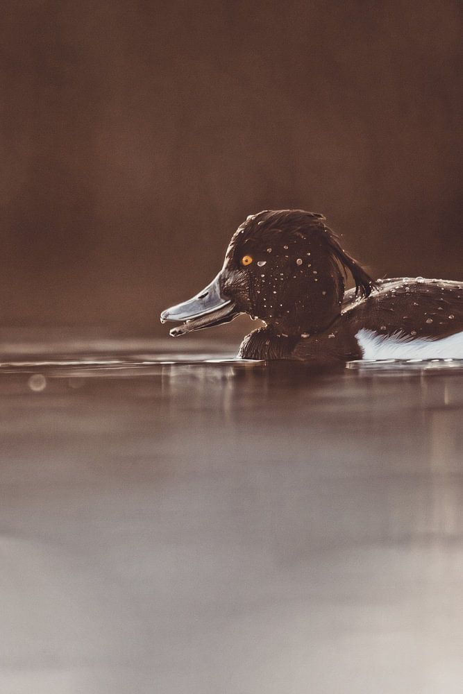 In this shot, a single duck glides almost silently over the surface of the water. Its dark plumage stands out against the soft, brown-grey background, while fine drops of water shine like tiny pearls on its back. The orange-coloured eye is particularly striking, appearing almost like a glowing dot in the semi-darkness and lending the image a mysterious intensity. The reflection in the slightly moving water remains delicate and blurred - a flowing transition between the animal and its surroundings. The shallow depth of field creates a calming, almost dreamlike atmosphere that focuses the eye entirely on the bird. This picture not only shows an animal in its natural environment, but also tells of stillness, concentration and the beauty that lies in simplicity.