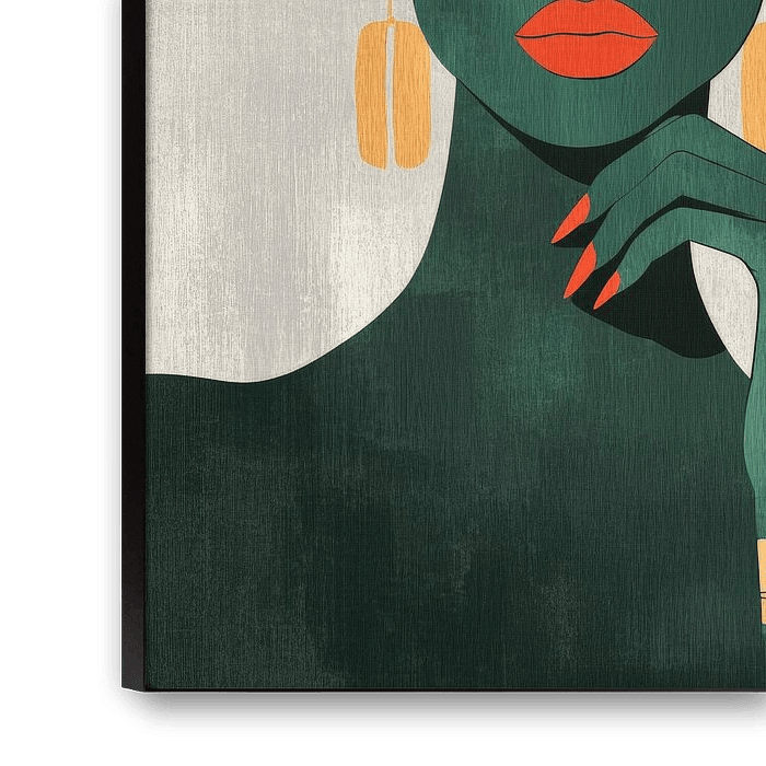 Elegance and style merge in this captivating work of art. The mysterious silhouette with an impressive straw hat and vivid red lips exudes confidence. The large-scale, warm shades of colour and stylish accessories make it a perfect focal point for your living room to add a touch of glamour.