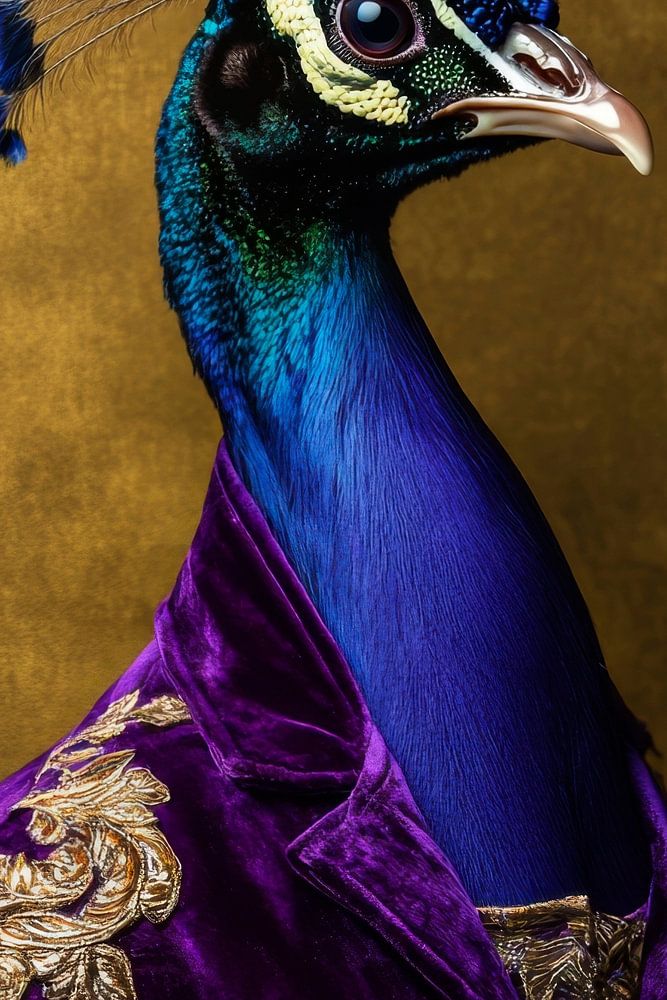 In shimmering purple, the magnificent peacock, majestic and elegant, wraps itself in an opulent robe with golden embellishments. Its radiant plumage combines colours of the sky and the earth, while the eye-catching mop of hair adds a touch of extravagance. A harmonious interplay of nature and fashion that captivates the eye and inspires the imagination.