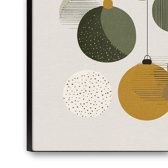This artwork features a set of refined holiday ornaments suspended from thin strings, each decorated with minimal line patterns, soft shadows, and delicate textures. Earthy greens, muted gold, terracotta, and warm cream tones create a sophisticated and calming palette.