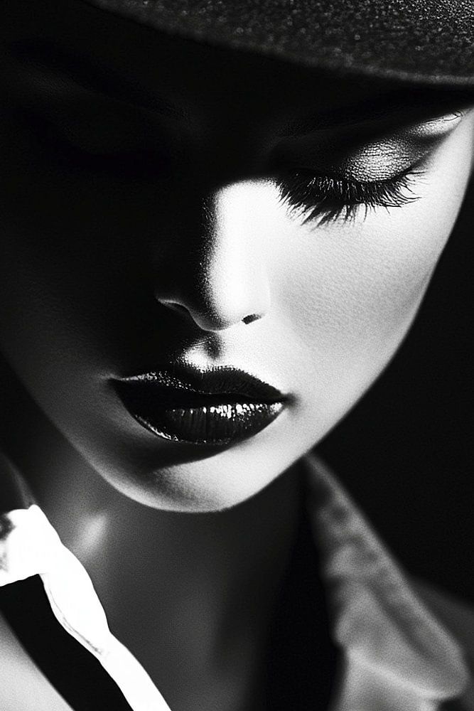 This image captures the essence of elegance and mystery with a woman in a black outfit and a veil partially hiding her face. The use of light and shadow creates a dramatic composition, ideal for art collections or interior decoration.