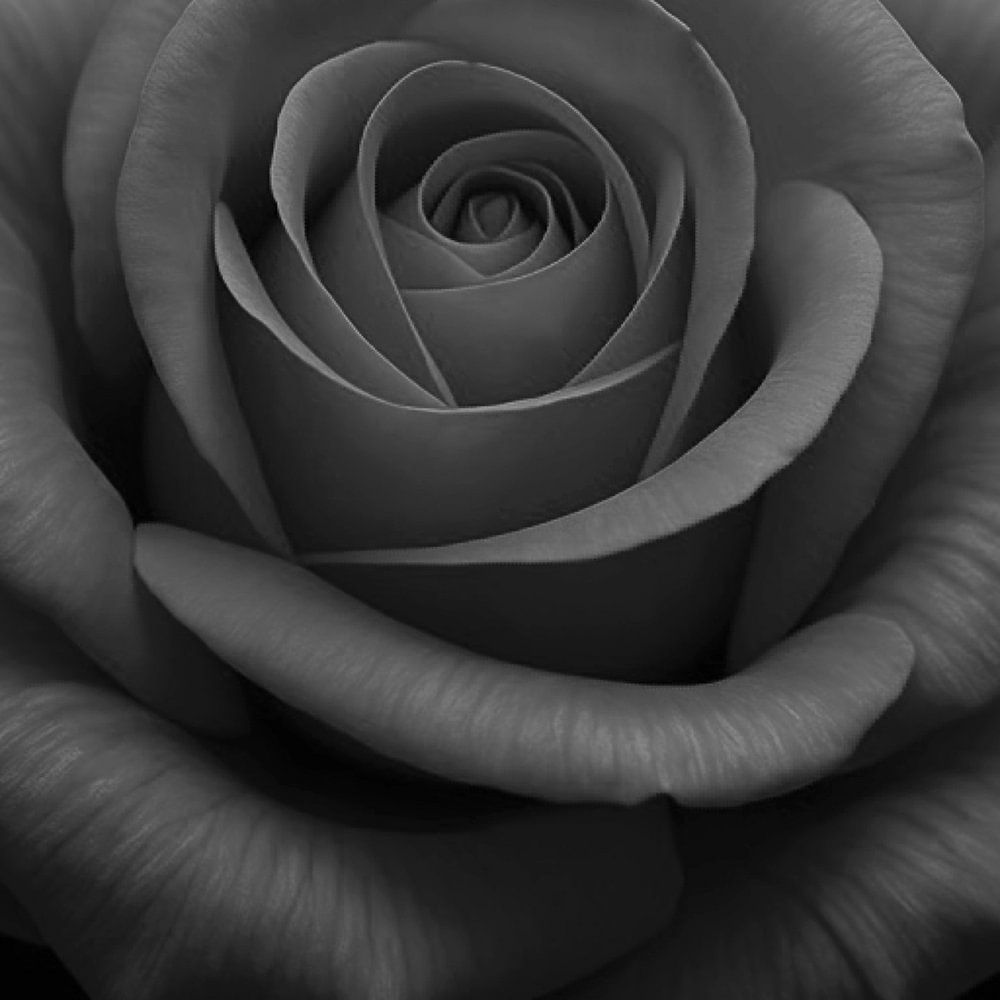 The picture shows a detailed close-up of a rose in black and white. The petals are finely textured and arranged in concentric circles, emphasising the natural symmetry and elegance of the flower. The background is completely black, making the rose in the foreground stand out and emphasising its delicate details and textures. This black and white presentation gives the image a timeless and classic aesthetic.