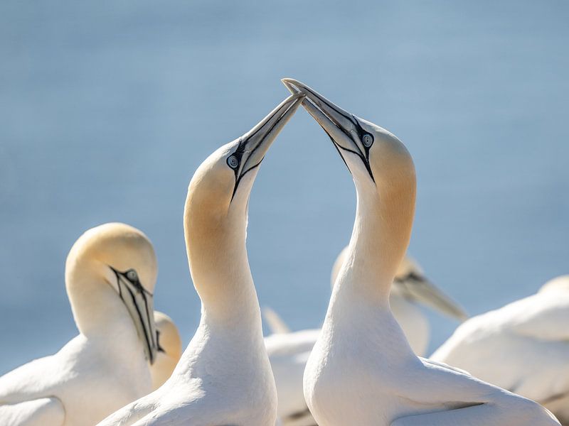 This minimalist nature photograph shows two Gannets in an intimate and perfectly symmetrical moment. Their graceful necks together almost form a heart, while the soft tones of white, cream and warm yellow blend harmoniously into the light blue background. The bright blue eyes and fine lines in the…