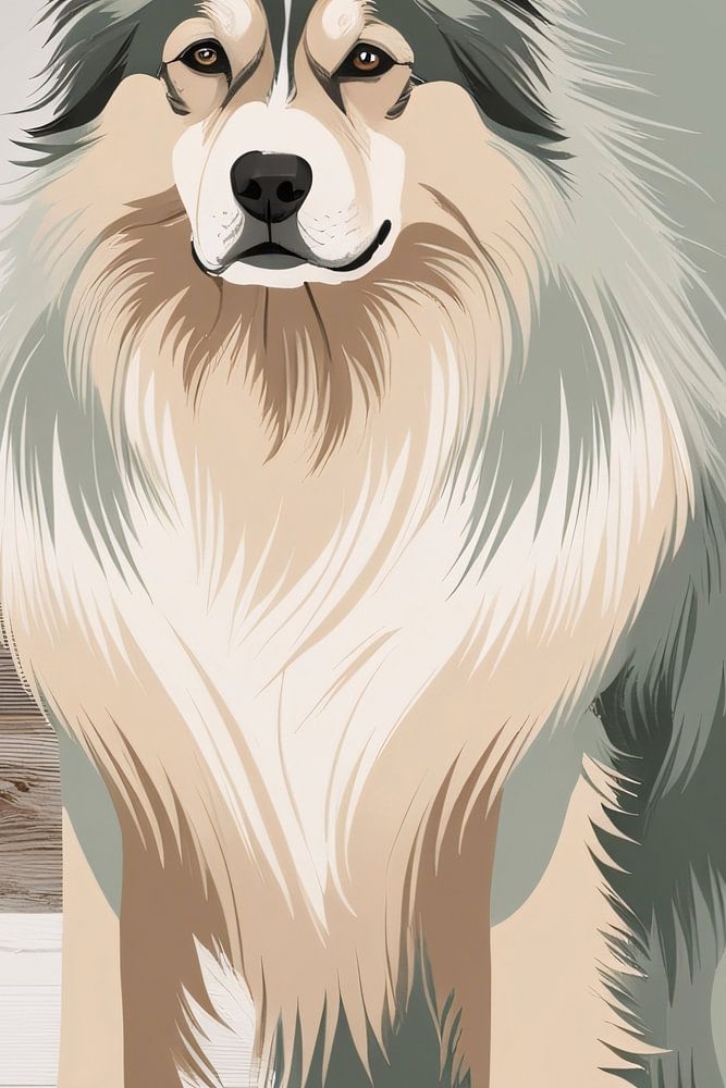 This beautiful digital artwork shows a majestic dog, lovingly rendered with soft colour transitions in shades of green, beige and grey. The design exudes calm and elegance, and is perfect for any space that could use a touch of nature and serenity. The dog has a relaxed, yet attentive pose, and comes alive through the subtle details in its fur. The background, with wood textures and soft tones, forms a harmonious setting that adds to the dog's spotlight. Ideal for lovers of animals and digital art, this work will enrich any interior, whether it hangs in the living room or in the office. A perfect choice for those who love modern, sophisticated art.