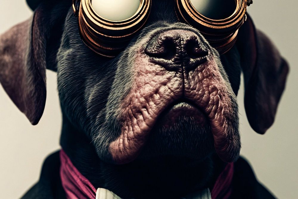 This unique design depicts an anthropomorphic dog with a striking, classic look. The dog wears a vintage-style hat and glasses, adding a touch of mystery and sophistication. The detailed rendering of textures and accessories makes this artwork an eye-catcher. Perfect as decoration in an office or living room, where it will make a statement and spark conversation. This artwork combines humour with style and gives any space a unique atmosphere.