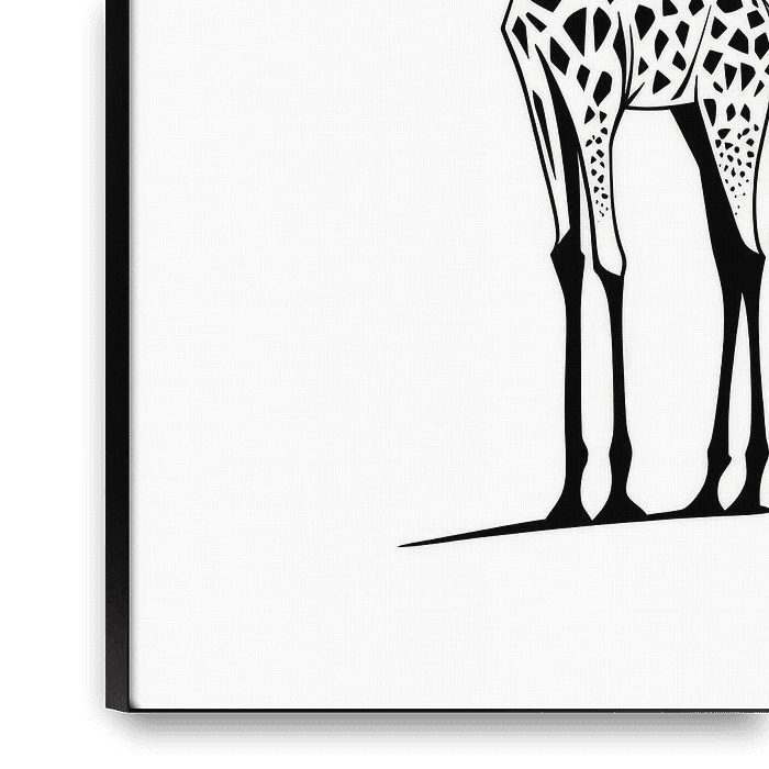 The picture shows an elegant giraffe in a stylised form, which stands out with its high legs and characteristic long neck. The high-contrast black and white design emphasises the unique patterning of the skin, while the all-black shadow area creates a fascinating depth effect and emphasises the grace of the animal.