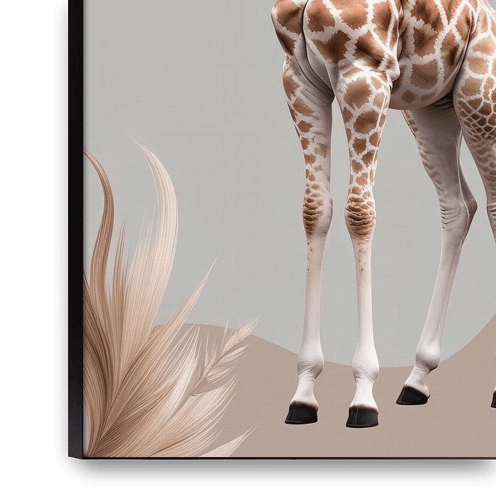 A beautiful design of a giraffe, rendered in a minimalist, modern style that draws attention with soft, natural colours and sophisticated details. The giraffe's high elegance is accentuated against a neutral background with abstract leaves, creating a serene and calming atmosphere. Perfect for any room that could use a touch of nature…