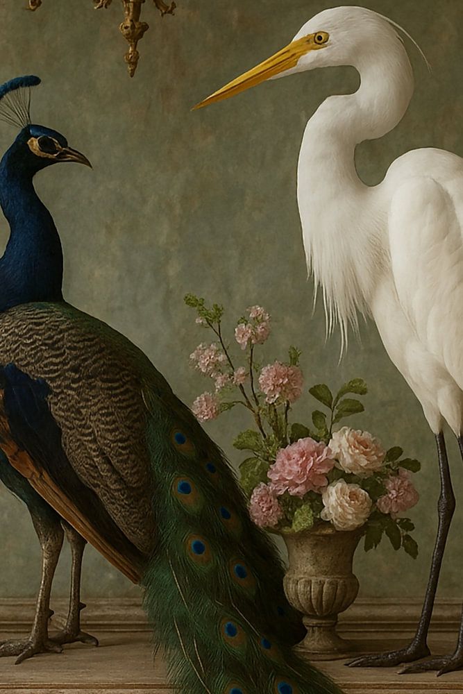 A graceful peacock and a white heron together in a classic setting, full of details and timeless beauty.