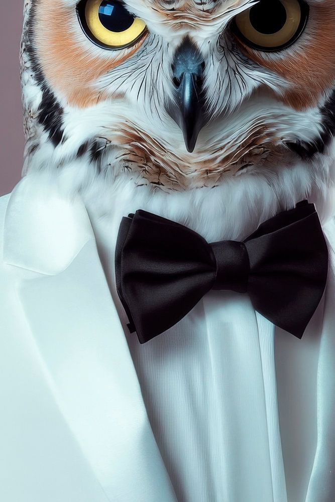 In a strikingly elegant white dinner jacket, a mighty eagle owl presents itself with impressive, piercing eyes. The contrast between the majestic bird's head and the formal attire conjures up a surreal combination of nature and luxury. An air of mystery surrounds this curvaceous apparition, which embodies both wisdom and style.