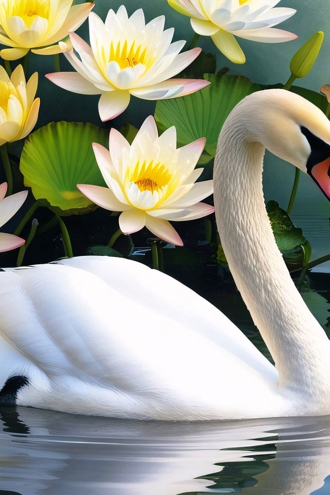 This design captures the serene beauty of a swan combined with beautiful water lilies. The elegant pose of the swan is reflected in the calm water, while the vibrant colours of the flowers offer a perfect contrast to the soft white of the swan. This image exudes calm and elegance, bringing nature to the fore in a sophisticated way. Ideal for a bedroom or dining room where a calm and classic atmosphere is desired.