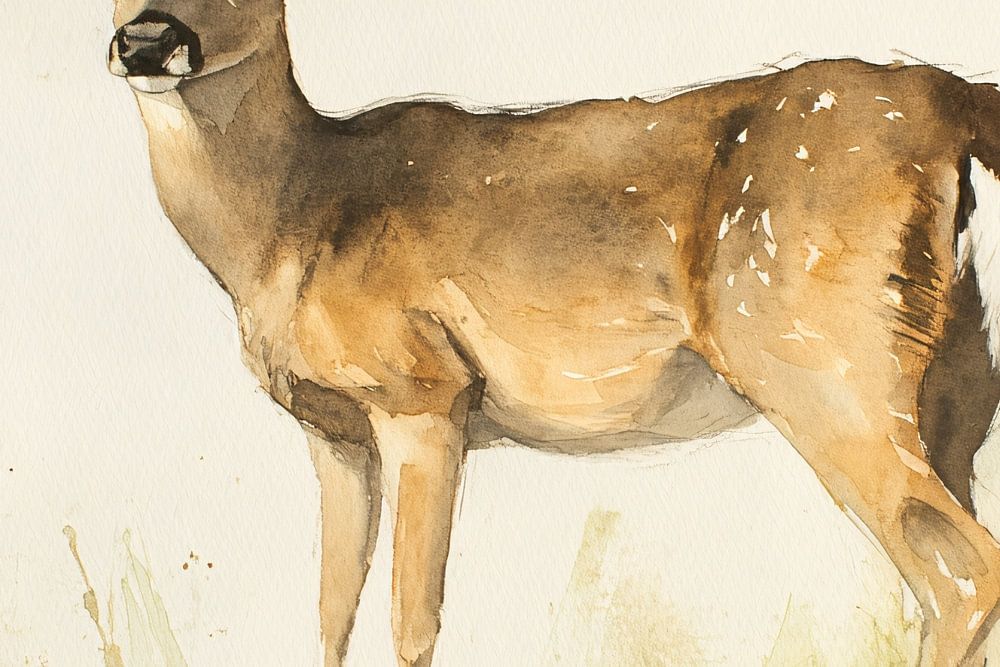 This beautiful watercolour design shows an elegant deer with graceful details and soft colours. The image exudes tranquillity and natural beauty, perfect for a serene atmosphere in the home or office. The use of warm tones such as brown and beige, combined with touches of green, makes it a versatile piece of art that fits into a variety of interiors. Hang it in the bedroom or office space for a subtle, natural look that brightens the space without being overpowering. This painting is a perfect choice for lovers of nature and art in a minimalist style.